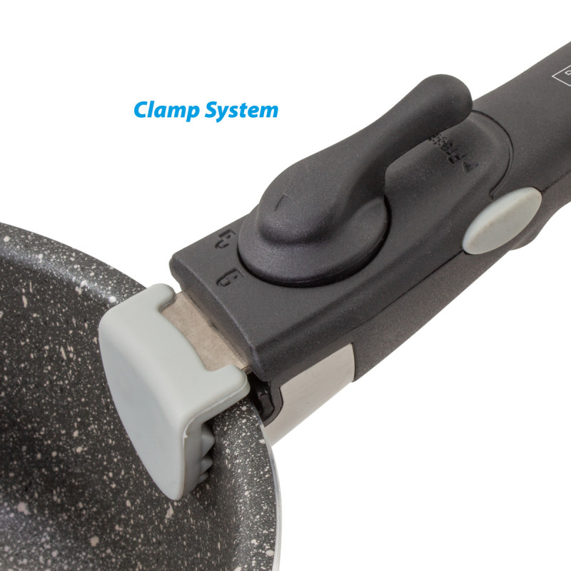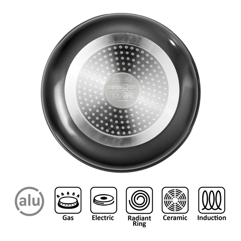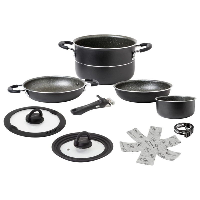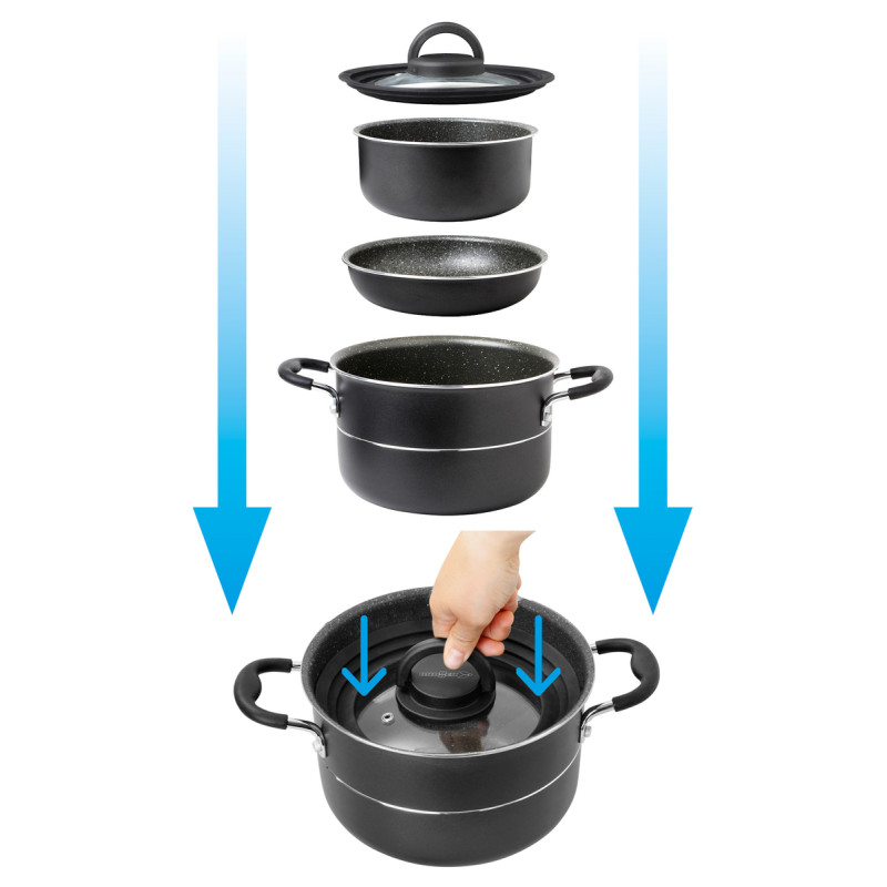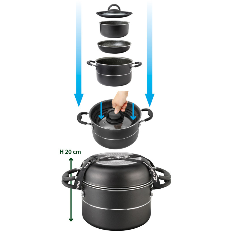 Set de cuisson Brunner Pirate NG 7+1 Ø 24 cm, empilable et compact, avec revêtement anti‑adhésif sans PFOA. Compatible gaz, induction, vitrocéramique et électrique. Poignées amovibles, système VacuBlock pour sécuriser le transport. Idéal pour van, camping‑car ou bateau.