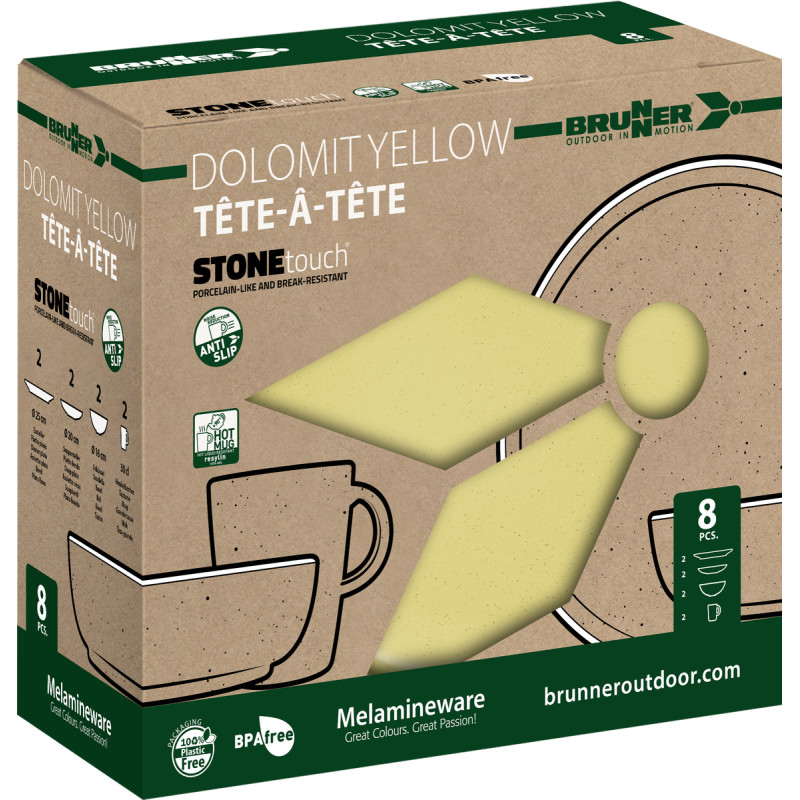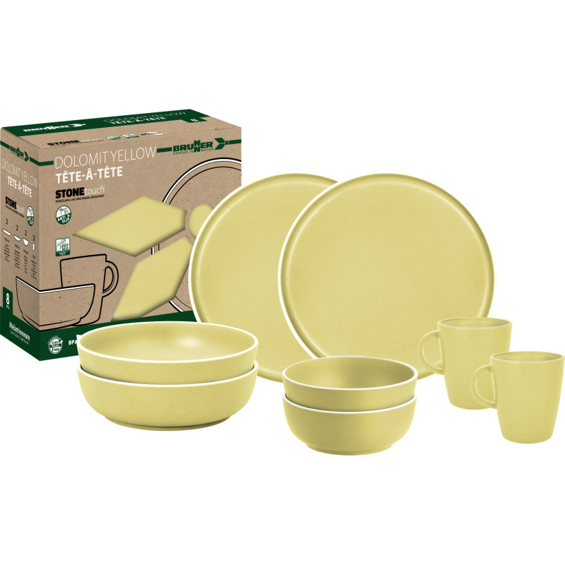 L’ensemble DOLOMIT de 8 pièces allie design moderne et qualité StoneTouch. Mélamine et minéraux offrent un toucher porcelaine, résistant et élégant. Chaque pièce est antiglisse. Comprend : 2 assiettes plates Ø25 cm, 2 assiettes dessert Ø20 cm, 2 bols Ø16 cm et 2 mugs 30 cl.