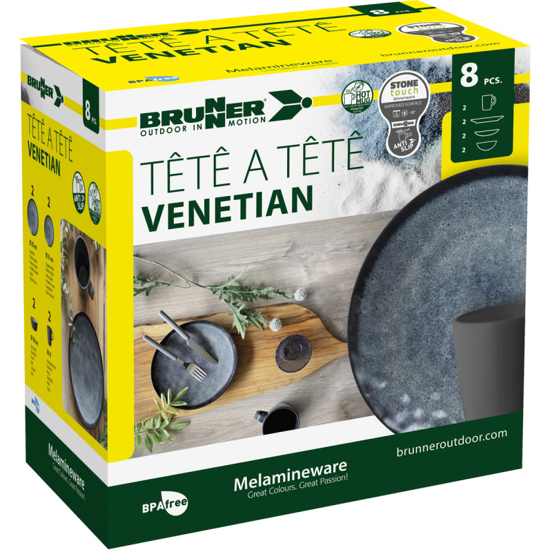 Service de vaisselle en mélamine « Stone Touch », comprenant 8 pièces : 2 assiettes plates, 2 assiettes à dessert, 2 bols, 2 mugs. Conçu pour un usage nomade, il combine robustesse, surface dure et design élégant.