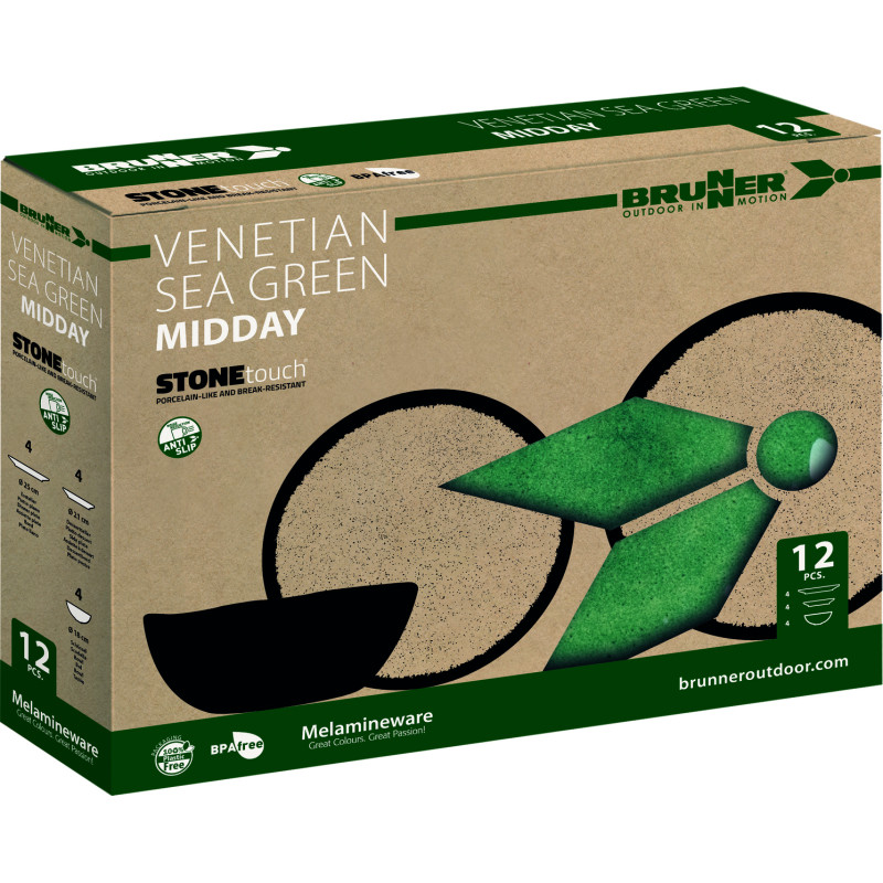 Service de vaisselle en mélamine « Stone Touch », comprenant 8 pièces : 2 assiettes plates, 2 assiettes à dessert, 2 bols, 2 mugs. Conçu pour un usage nomade, il combine robustesse, surface dure et design élégant.