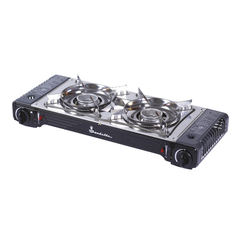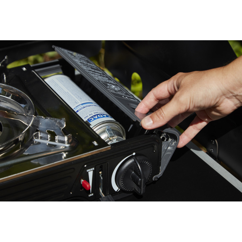 Pour les préparations culinaires en voyage, fonctionne sans électricité. Le réchaud est en acier inoxydable, facile à nettoyer. Une plaque grill, disponible en option, vous permet également de faire des grillades en plein air.
