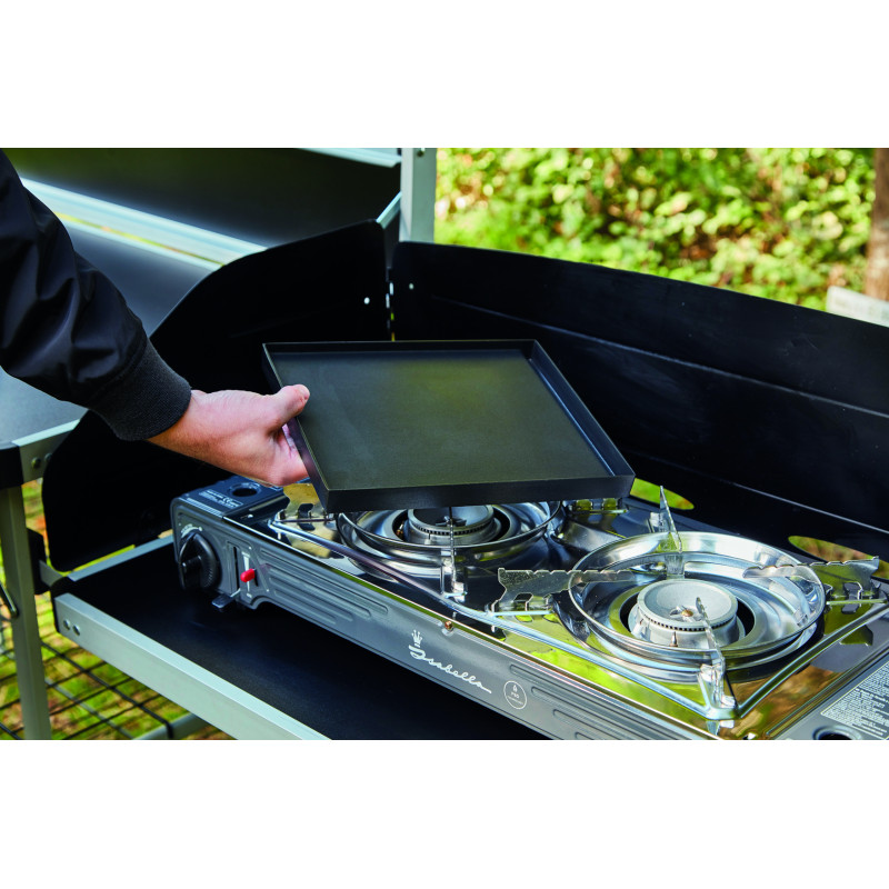 Pour les préparations culinaires en voyage, fonctionne sans électricité. Le réchaud est en acier inoxydable, facile à nettoyer. Une plaque grill, disponible en option, vous permet également de faire des grillades en plein air.