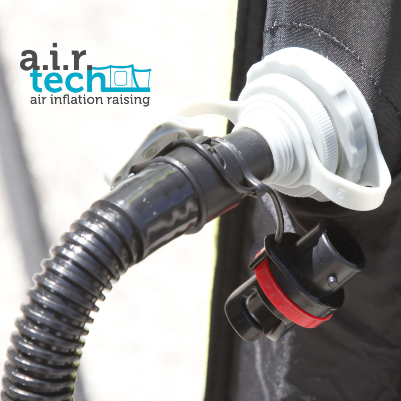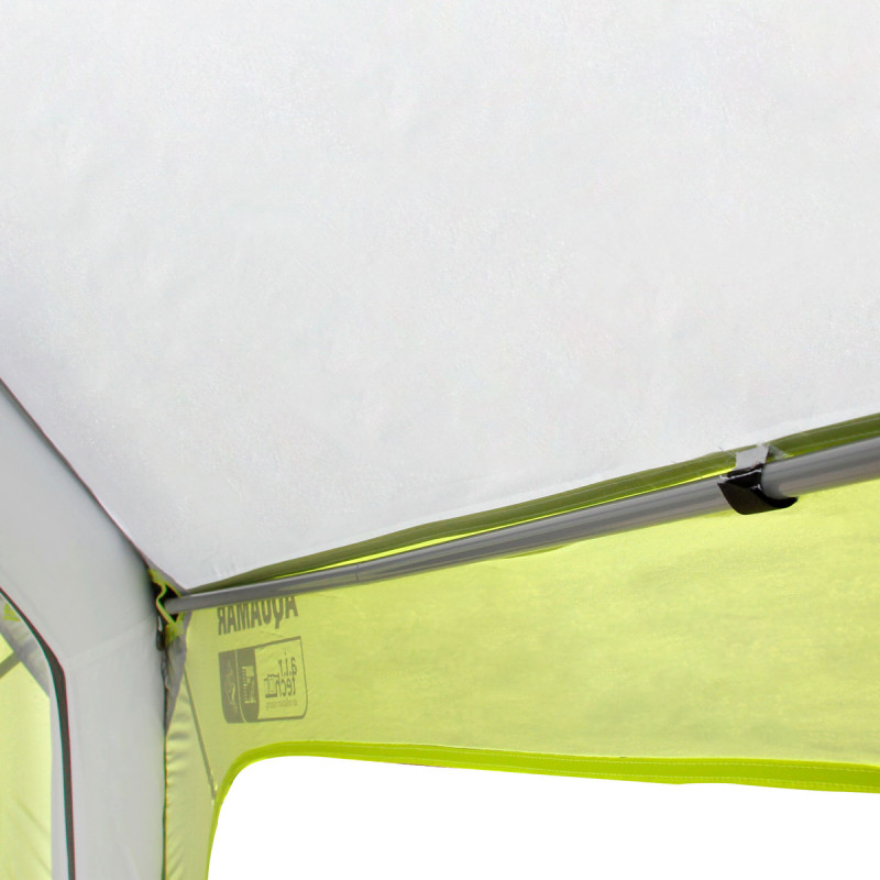 L'Aquamar offre un espace de vie bien protégé pendant votre séjour à la plage, dans le jardin ou à côté de votre caravane ou camping-car. Aquamar se gonfle en moins de 2 minutes à l'aide d'une pompe double action incluse, offrant une protection instantanée contre le soleil et la pluie.