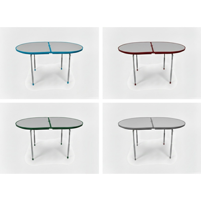 Table pliante ovale conçue pour un usage extérieur en jardin, camping ou vanlife. Hauteur réglable de 52 à 73 cm, plateau stratifié résistant à la chaleur, à l’eau et aux UV, et trou central pour parasol.