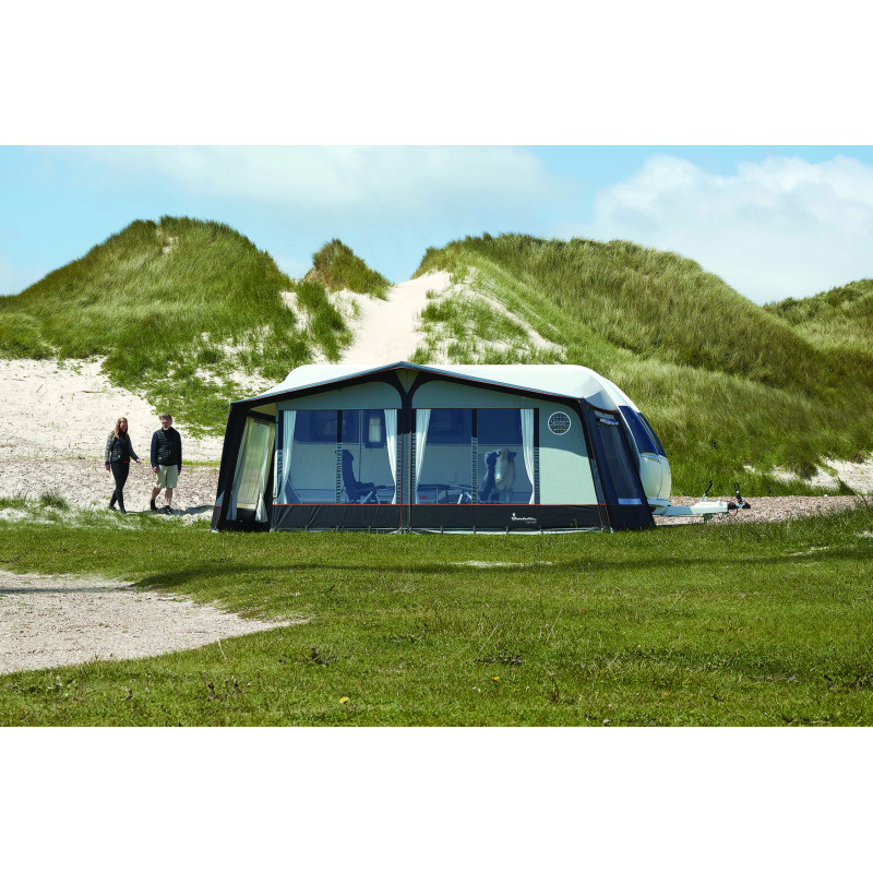 Véritable auvent de voyage, il est léger, facile à installer et offre une profondeur de 2,50 m pour un espace de vie confortable. Confectionné en Isacryl respirant, il assure un climat intérieur agréable. Les moustiquaires latérales garantissent une bonne aération, tandis que le toit enduit avec motif intérieur limite la condensation.