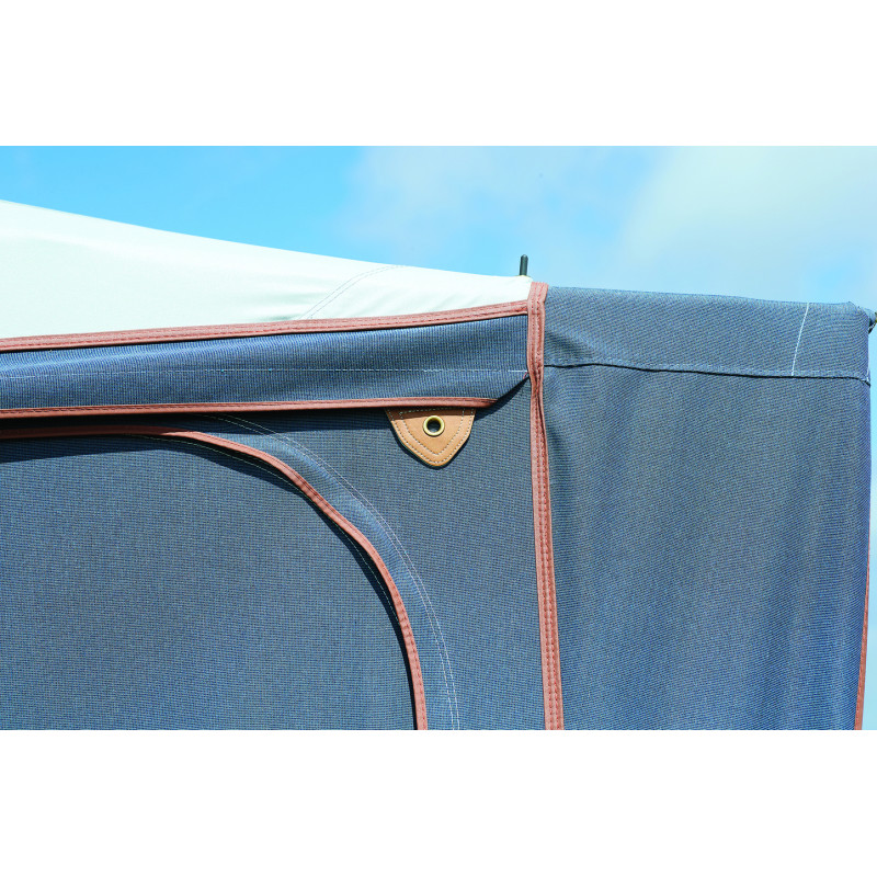 Véritable auvent de voyage, il est léger, facile à installer et offre une profondeur de 2,50 m pour un espace de vie confortable. Confectionné en Isacryl respirant, il assure un climat intérieur agréable. Les moustiquaires latérales garantissent une bonne aération, tandis que le toit enduit avec motif intérieur limite la condensation.
