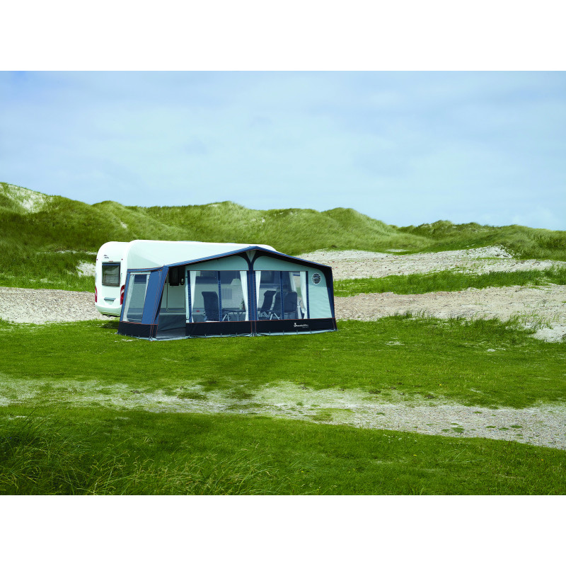 Véritable auvent de voyage, il est léger, facile à installer et offre une profondeur de 2,50 m pour un espace de vie confortable. Confectionné en Isacryl respirant, il assure un climat intérieur agréable. Les moustiquaires latérales garantissent une bonne aération, tandis que le toit enduit avec motif intérieur limite la condensation.