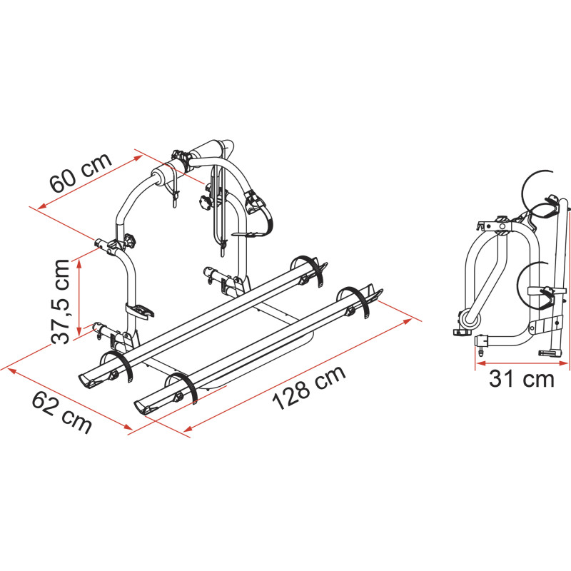 Porte-vélos à structure fixe et 39,5 cm de haut. Livré sans les pattes supérieures et inférieures déjà installées, avec écartement de 60 cm, (de série seulement sur les camping-cars CI et Roller Team).