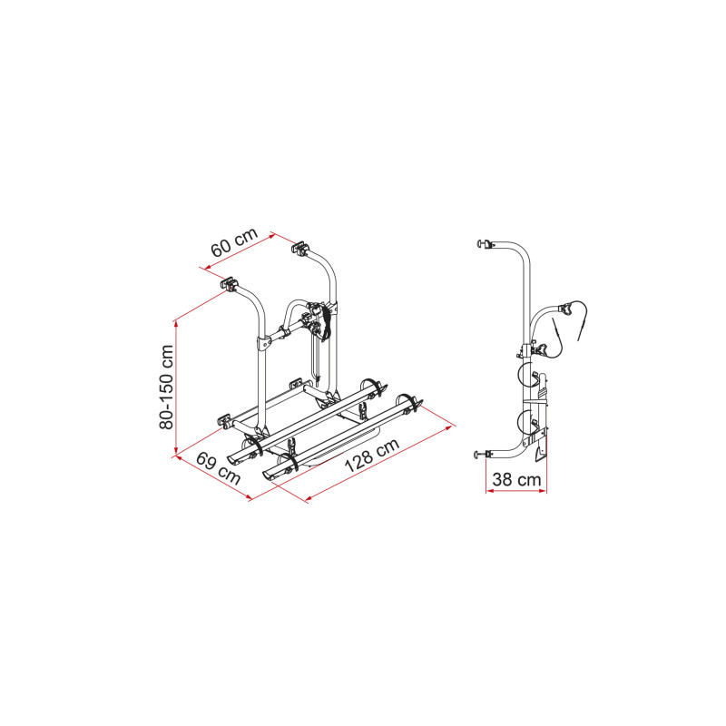 Porte-vélos télescopique avec structure réglable de 80 à 150 cm pour mieux s’adapter aux différentes possibilités de montage.