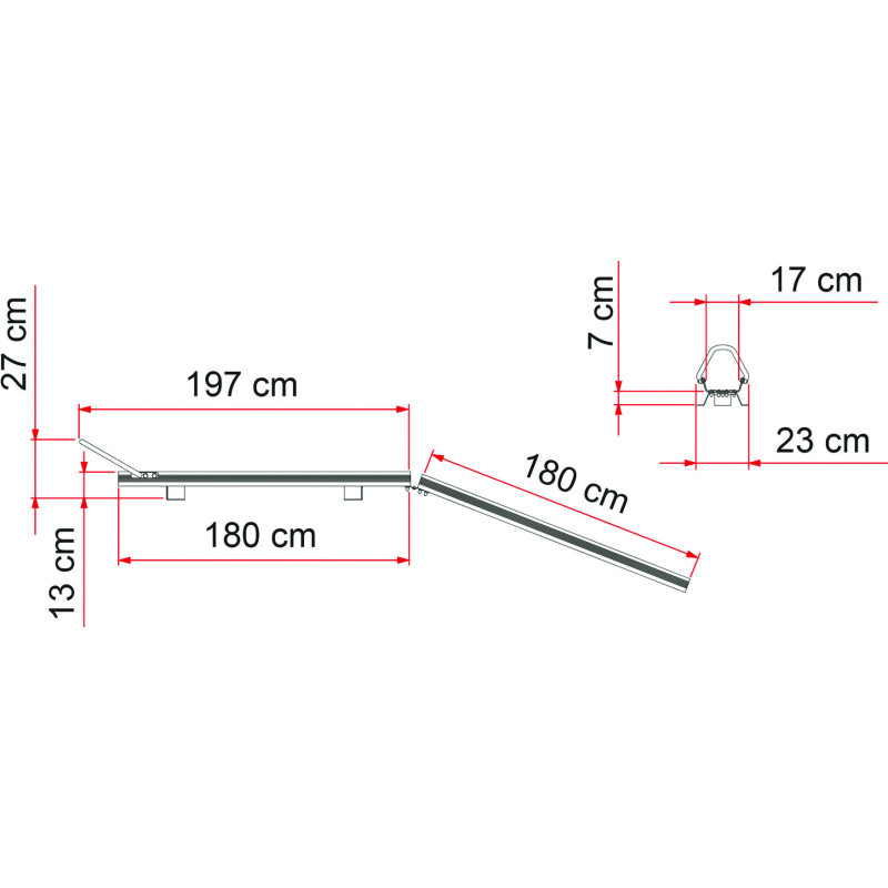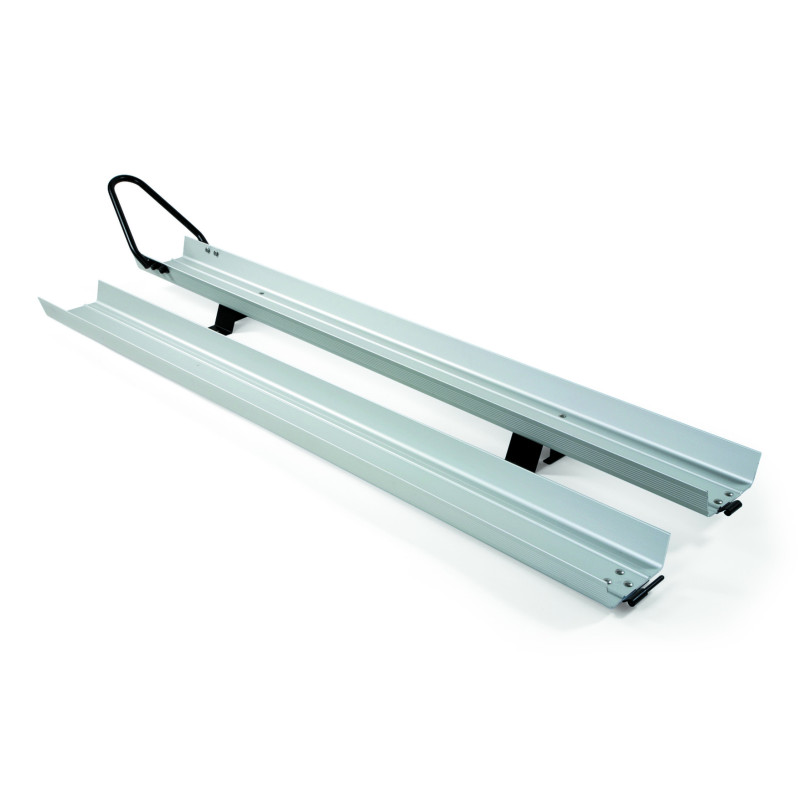 Composé d’un rail porte-moto en aluminium anodisé et d’une rampe d’accès facilement encastrable sur le rail arrimé au plancher,