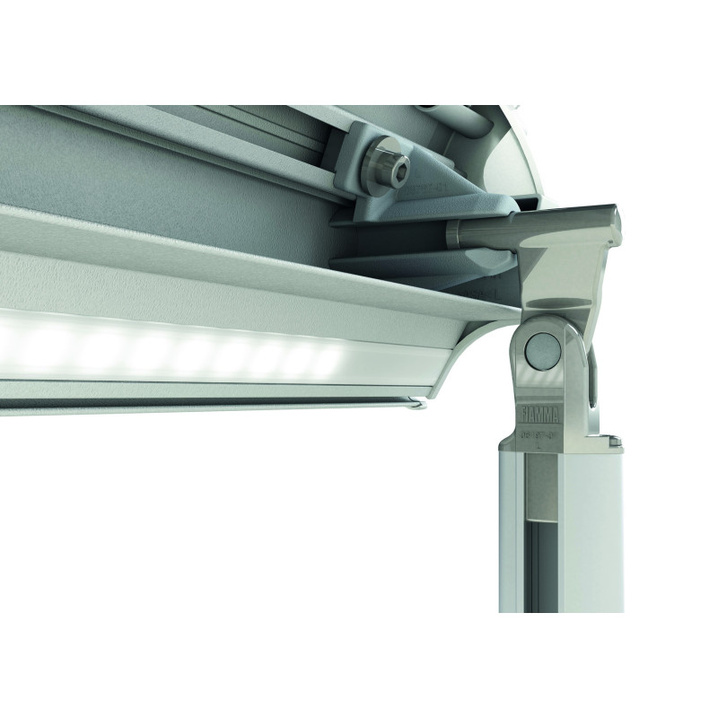 À l’intérieur du boîtier [1] et du bandeau frontal [2], présence d’emplacements pour l’ajout optionnel du kit d’éclairage sur toute la longueur LED Strip Awning (bande adhésive de 5 m).